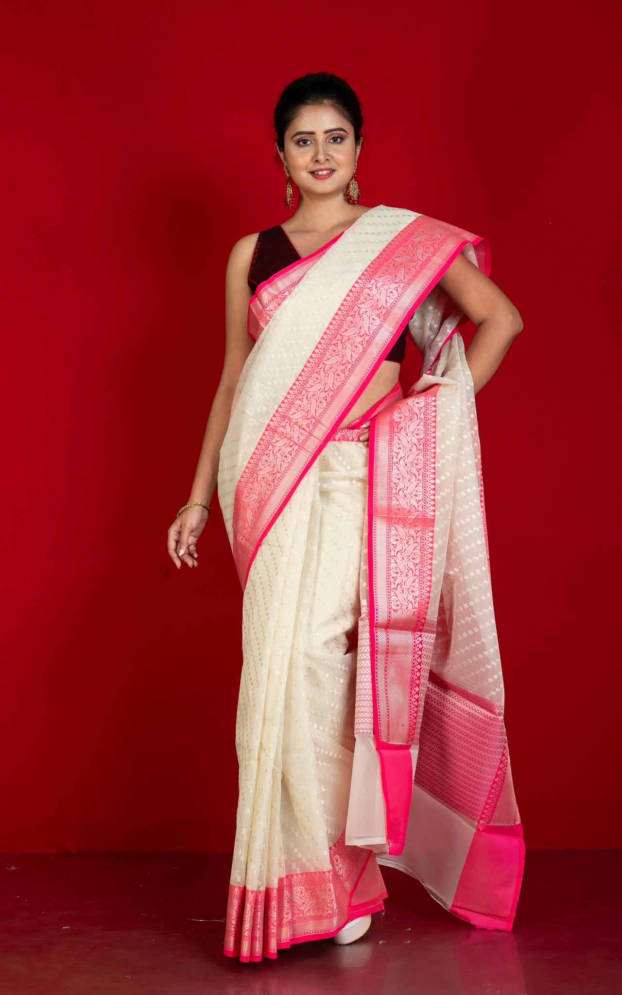 Elevate your style with our Designer Kora Organza Silk Banarasi Saree in Antique White and Deep Pink. Made from luxurious organza silk, this saree features intricate banarasi work in a stunning color combination. Perfect for any occasion, this saree will make you stand out with its elegant and timeless design.