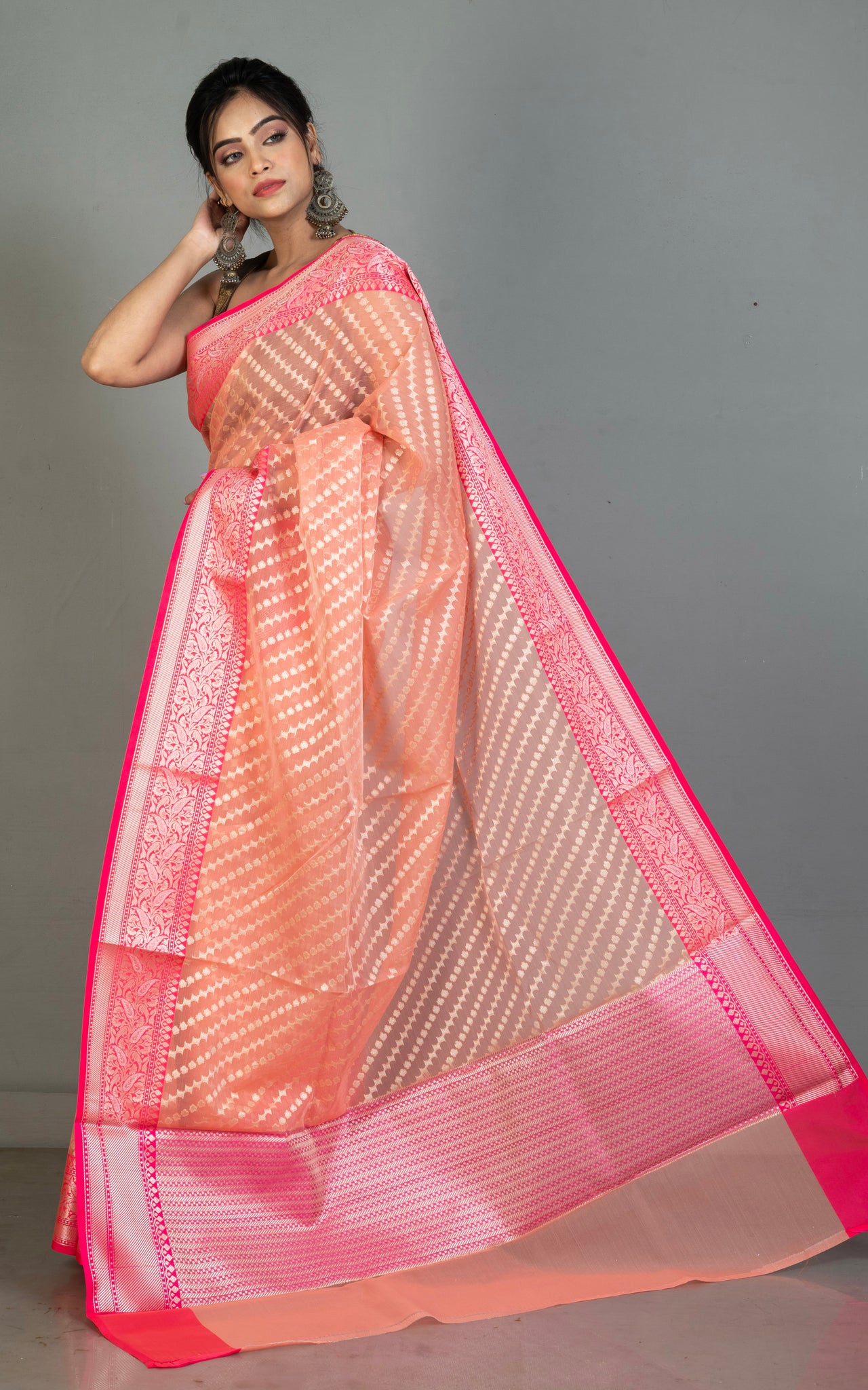 Elevate your style with our Designer Kora Organza Silk Banarasi Saree in Light Coral and Deep Pink. Made from luxurious organza silk, this saree features intricate banarasi work in a stunning color combination. Perfect for any occasion, this saree will make you stand out with its elegant and timeless design.