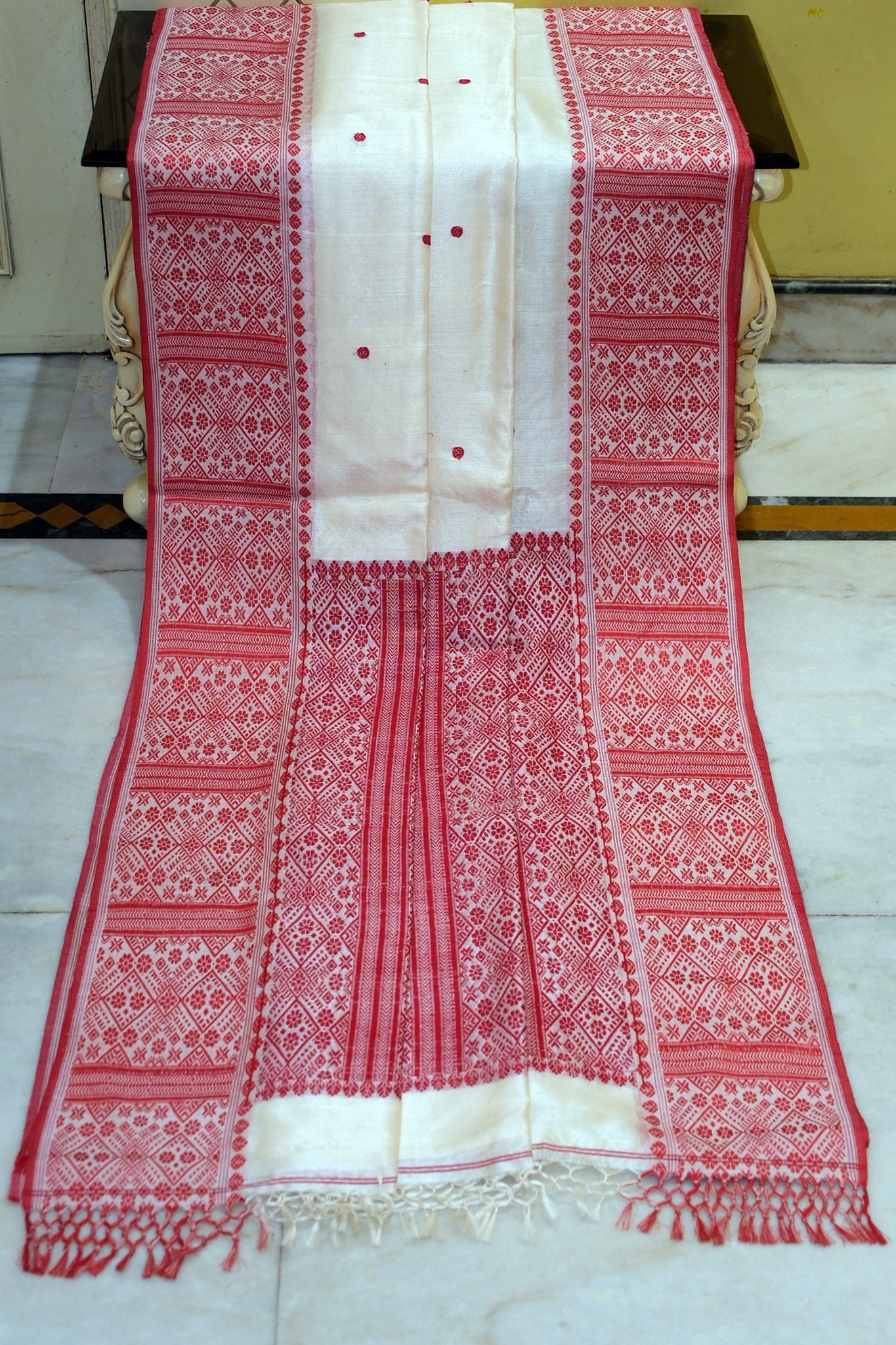 Discover the timeless elegance of this handwoven Tussar silk saree, inspired by traditional Assamese Nakshi motifs. Crafted with meticulous artistry, the saree features delicate floral patterns in pristine white and vibrant red, showcasing the natural texture and subtle sheen of premium Tussar silk. Each thread reflects generations of weaving heritage, making this piece a celebration of authentic craftsmanship. Perfect for special occasions or as a treasured addition to your collection, this saree embodies the sophistication of Indian textile traditions with contemporary appeal.