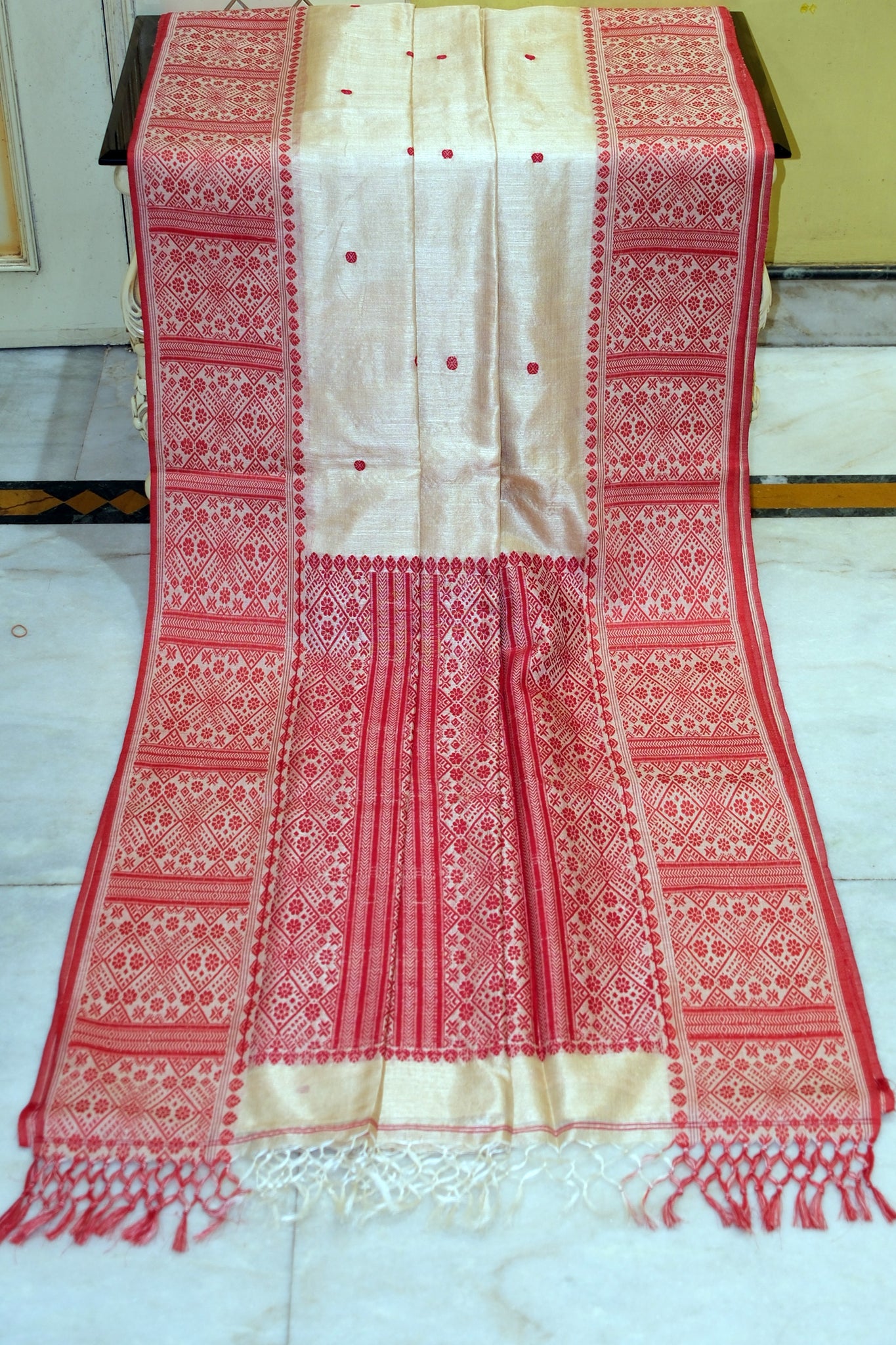 Exquisite Assamese Nakshi motifs adorn this premium handwoven Tussar silk saree in elegant parmesan beige and vibrant red. Each intricate pattern reflects traditional craftsmanship passed through generations. The natural sheen and texture of Tussar silk offers lightweight comfort while providing a sophisticated drape for special occasions. A timeless heirloom piece that celebrates India's rich textile heritage.