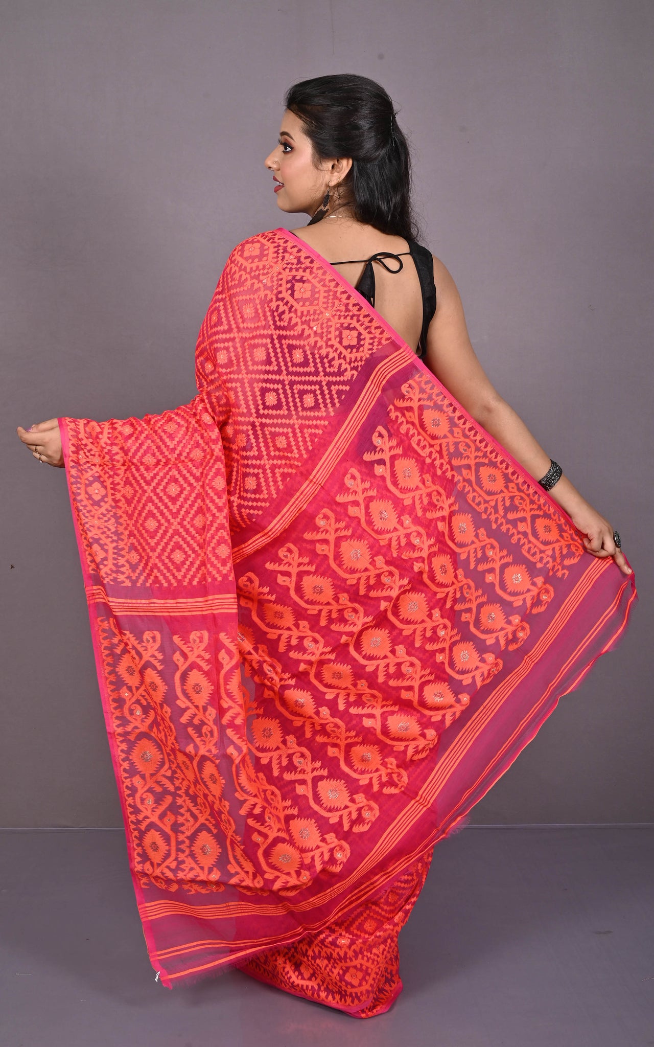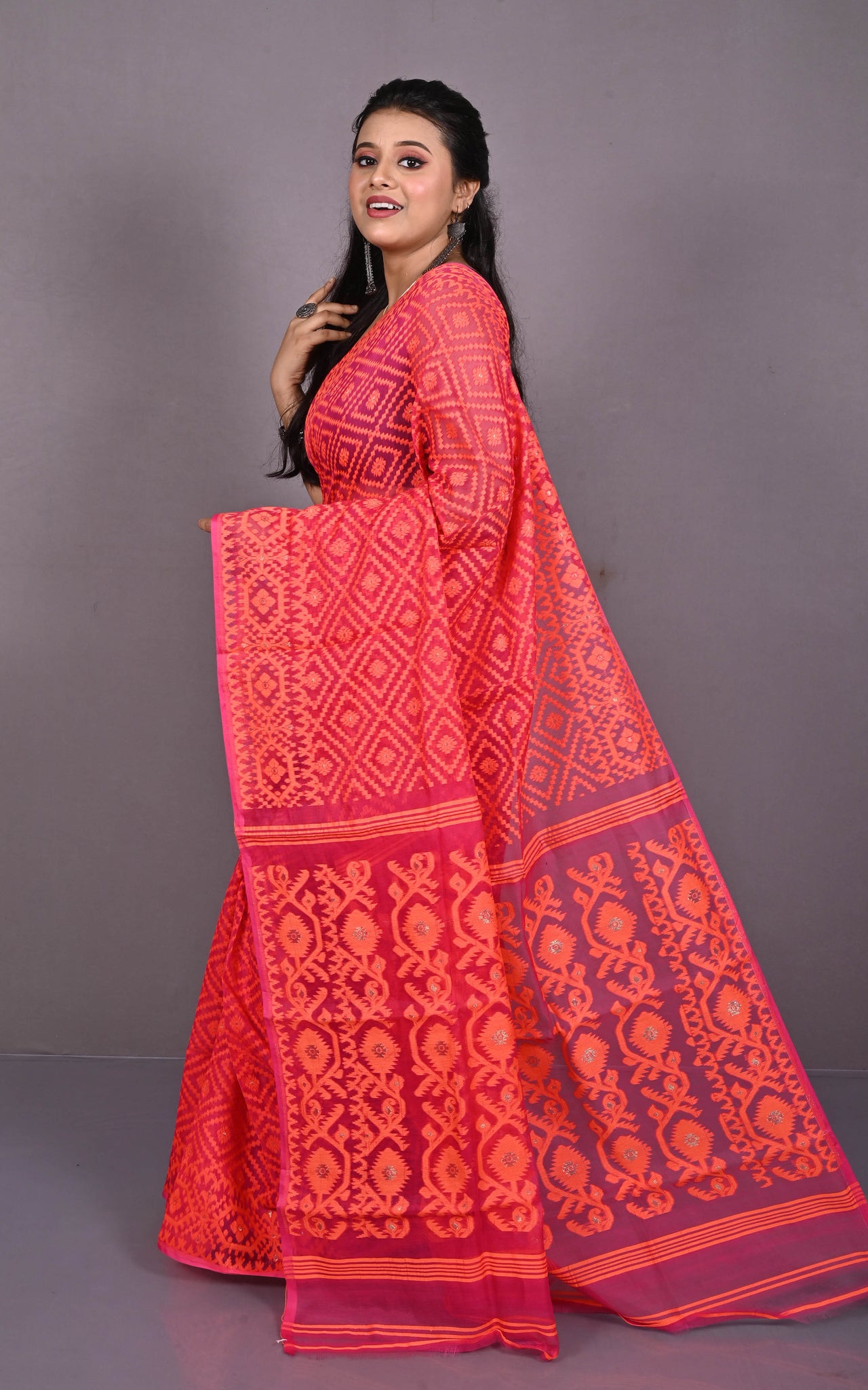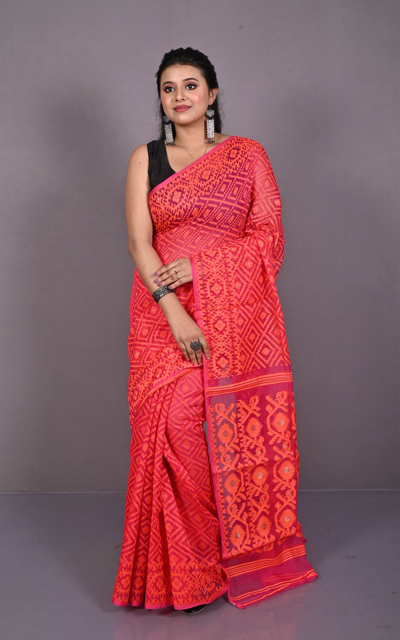 Traditional Cotton Muslin Soft Jamdani Saree in Sunset Orange, Pink and Gold