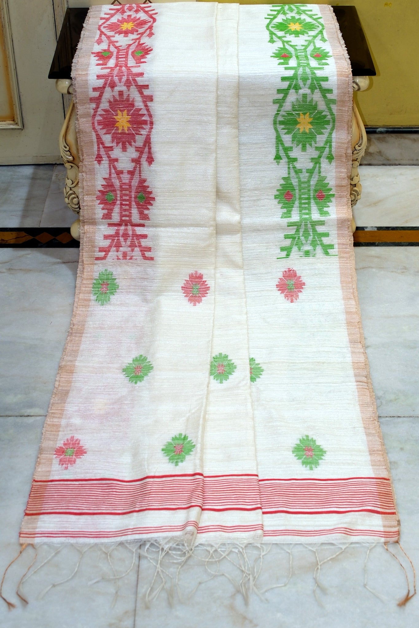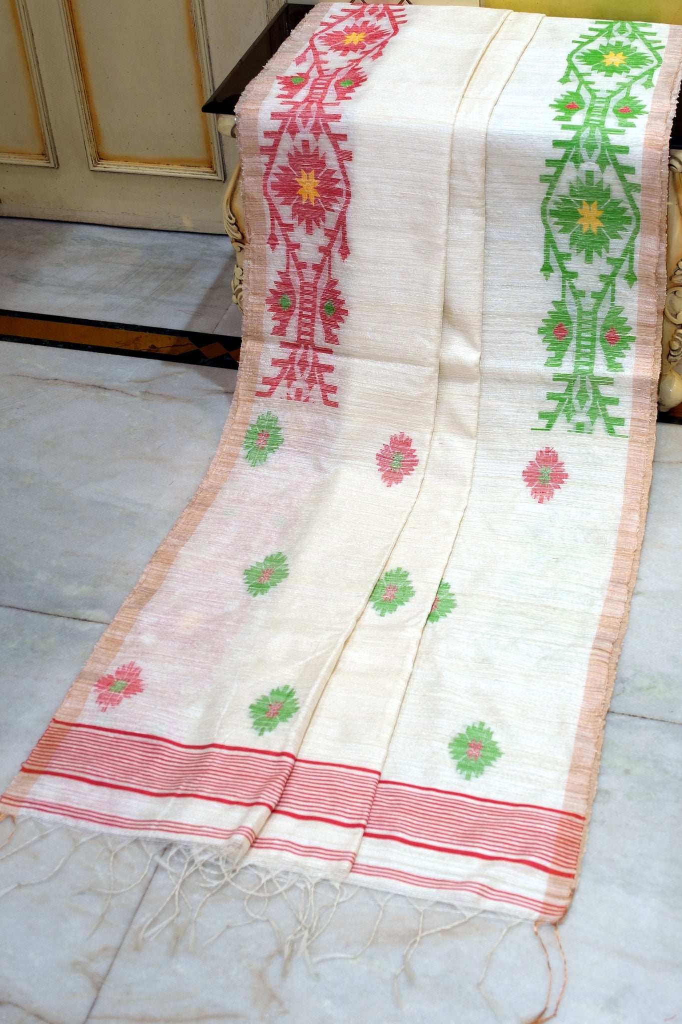 Discover the timeless elegance of this exquisite Jamdani saree, meticulously crafted from pure Matka silk with intricate needle Karat Nakshi work. The sophisticated color palette—off white, Red, Green, and antique golden—creates a harmonious blend of tradition and contemporary style. Each motif is painstakingly woven by skilled artisans, showcasing the heritage of Bengal's finest handloom craftsmanship. Perfect for weddings, celebrations, and special occasions, this saree drapes beautifully and promises heirloom-quality wear. A true testament to premium weaving excellence.
