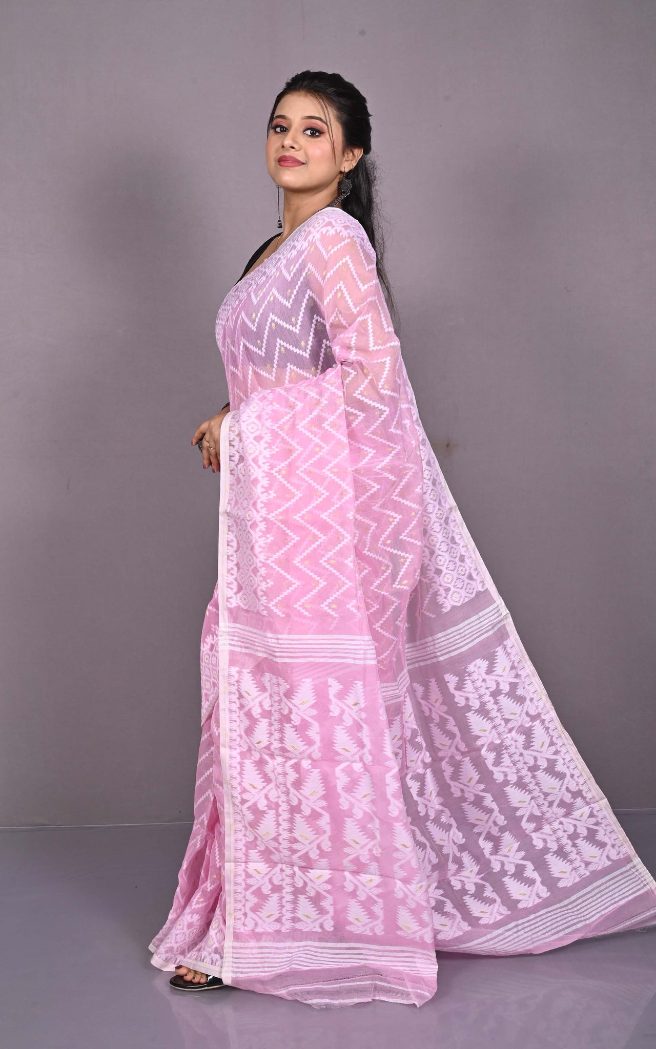 Traditional Cotton Muslin Soft Jamdani Saree in Light Pink, Off White and Gold