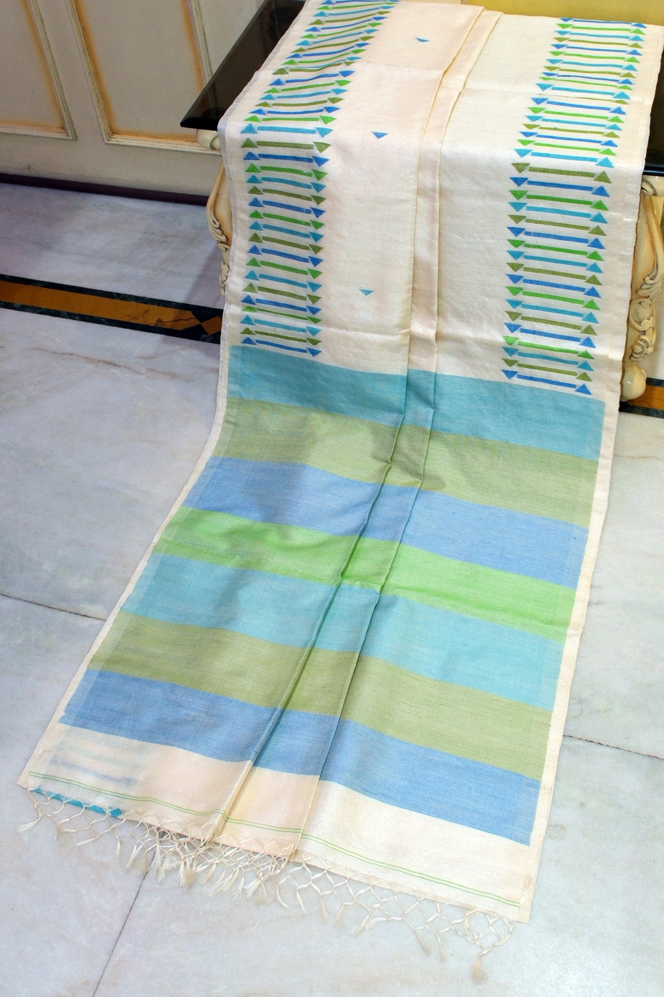 Premium Quality Designer Handwoven Work Tussar Silk Saree in Antique White, Picton Blue, Mantis Green and Khaki Green