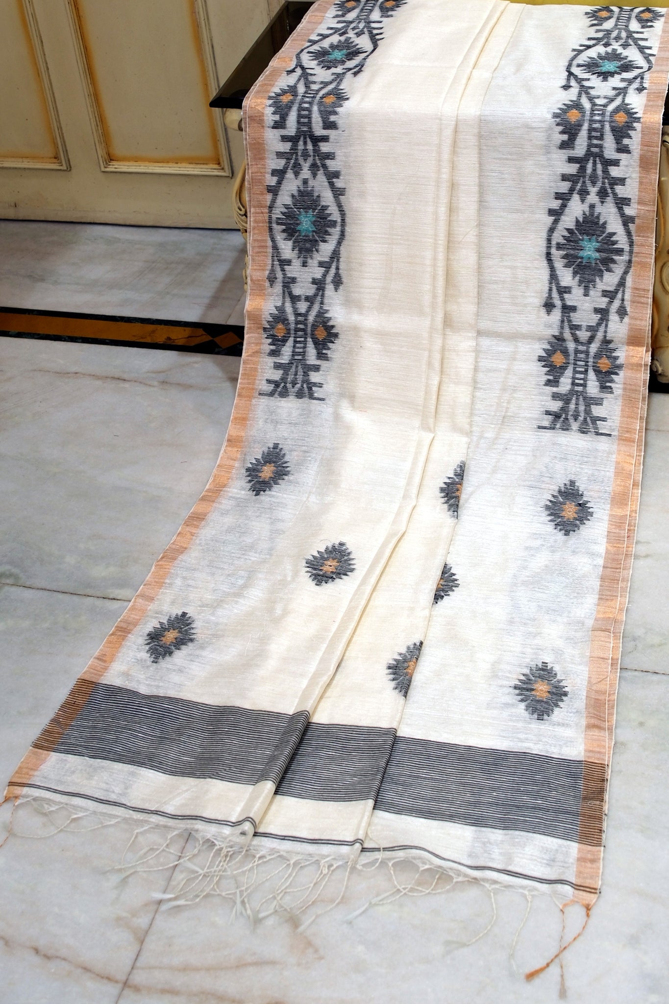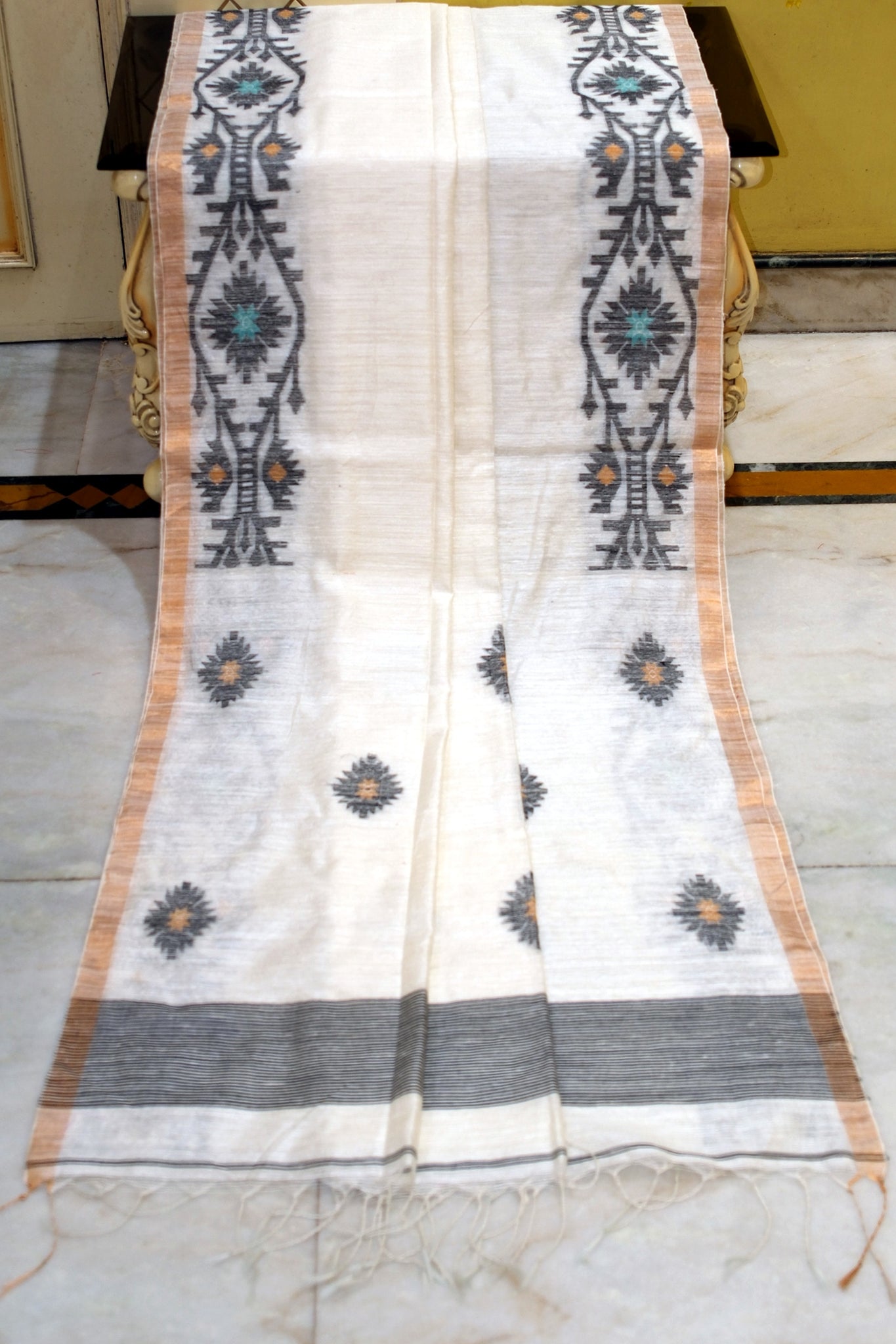 Discover the refined artistry of Bengal's celebrated Jamdani weaving tradition in this stunning Pure Matka Silk saree. Each piece is painstakingly crafted with delicate Nakshi needle work and ornate Karat embellishments, reflecting generations of handloom mastery. The sumptuous matka silk fabric offers a distinctive texture and luminous quality that elevates any ensemble. Choose from five timeless hues—Off White, Black, Mustard, Sea Green, and Antique Golden—each selected to complement the intricate woven patterns. A cherished investment in authentic heritage and uncompromising craftsmanship.