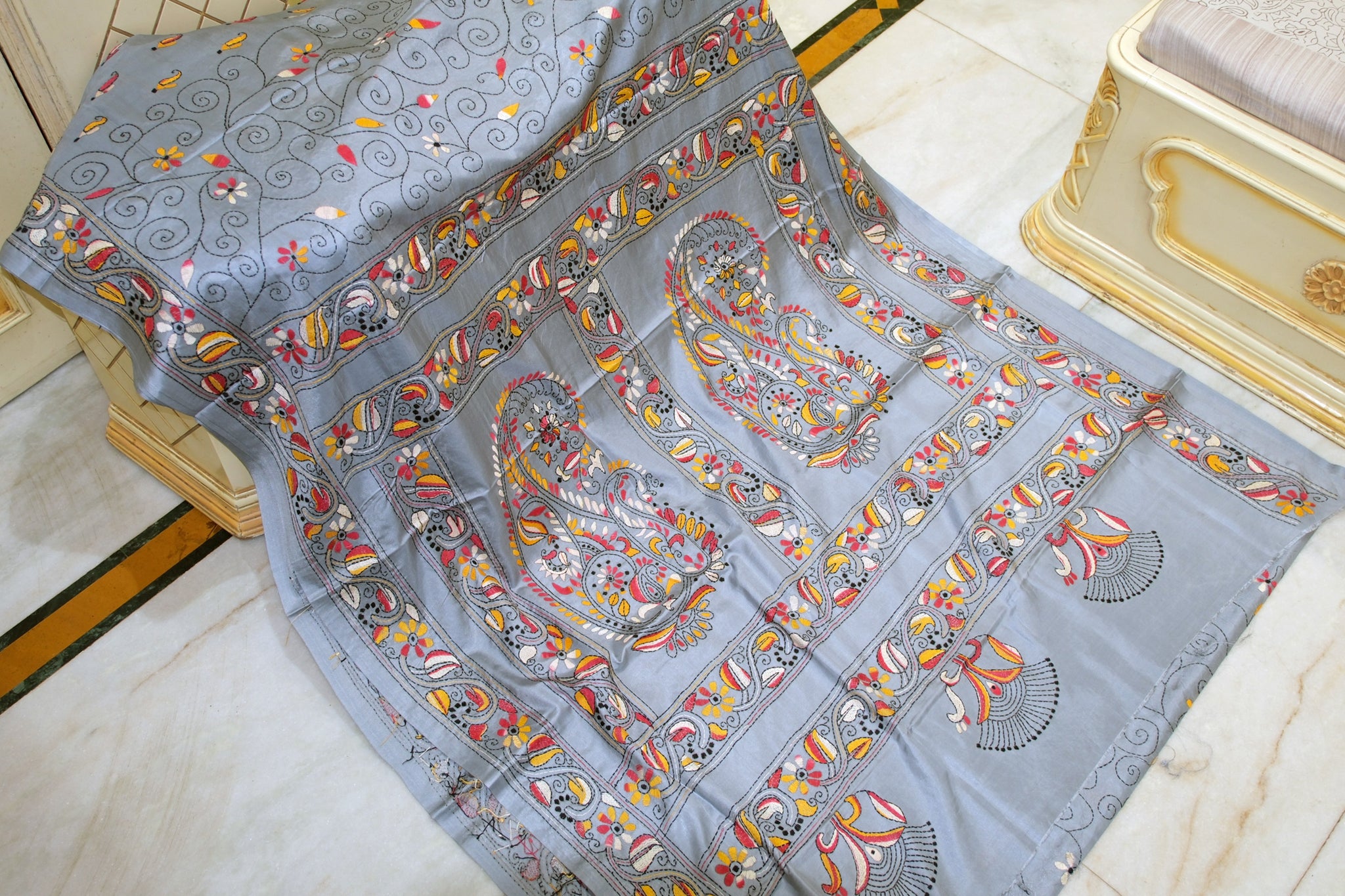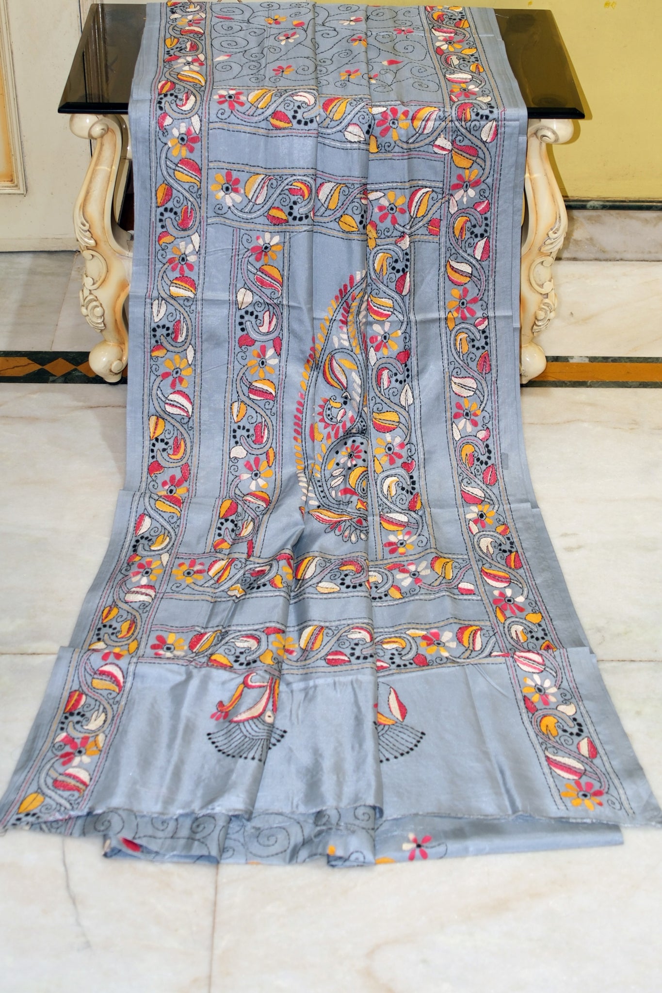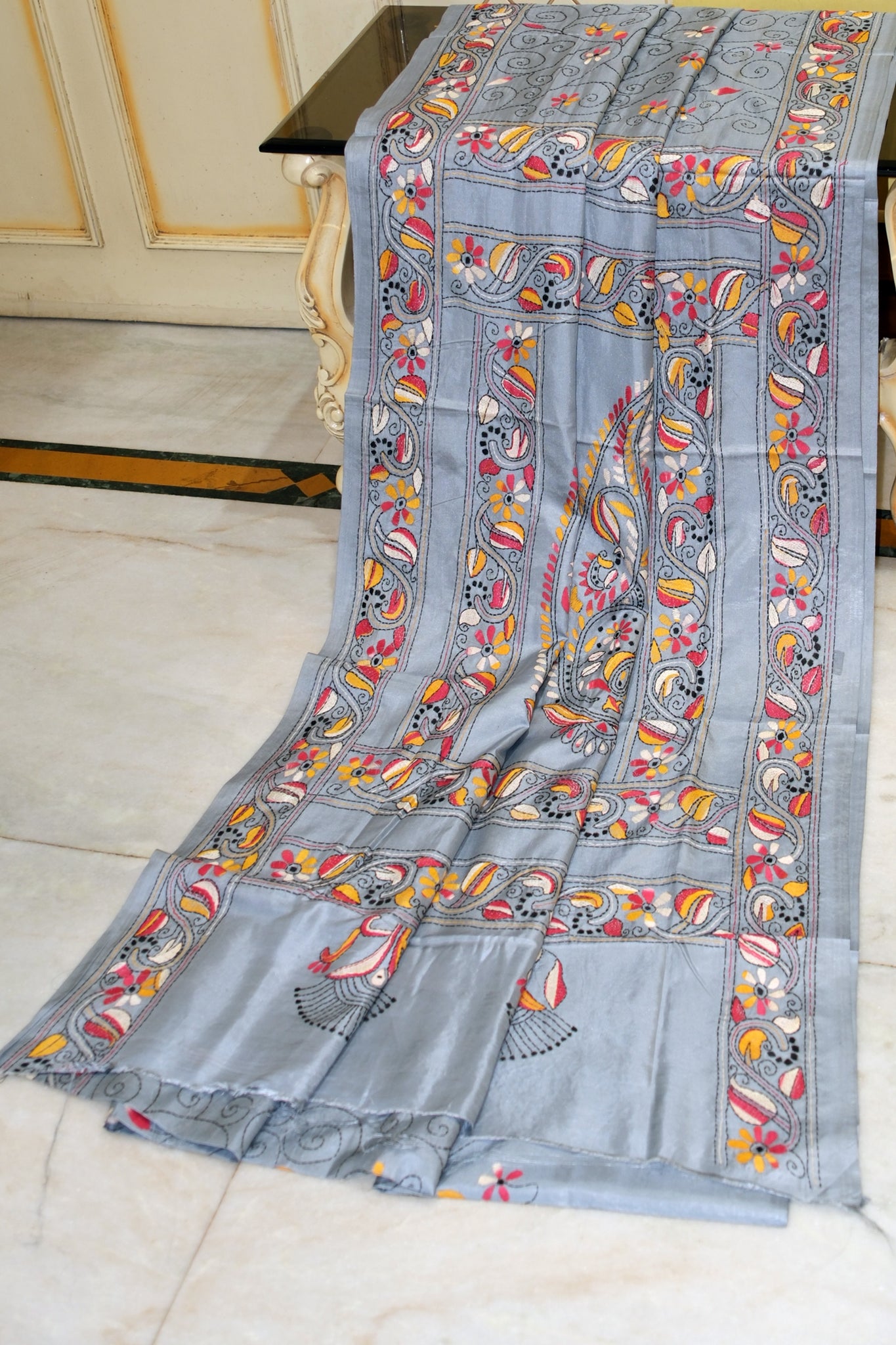 Hand Embroidery Floral Nakshi Jaal Work Kantha Stitch Saree on Blended Bangalore Silk