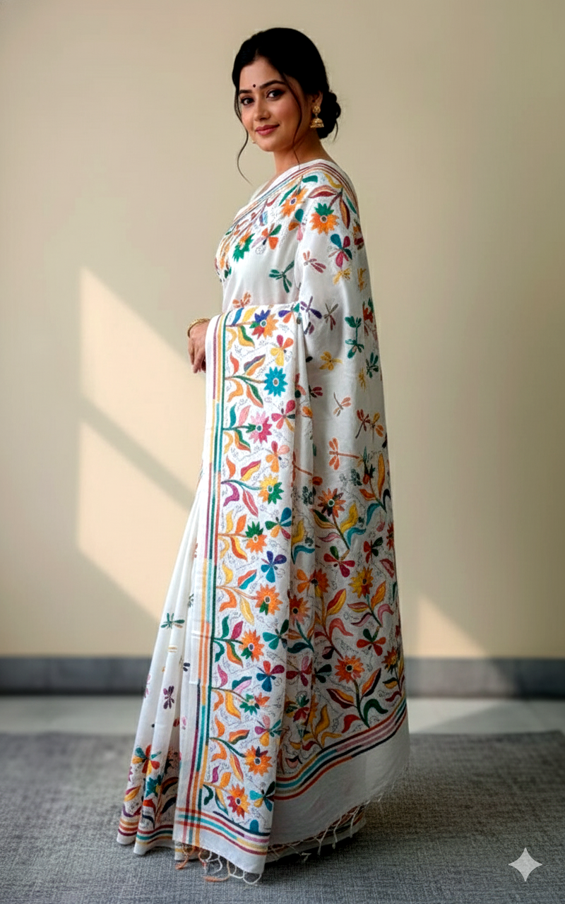 Hand Embroidery Floral and Butterfly Nakshi Work Kantha Stitch Saree on Blended Bangalore Silk