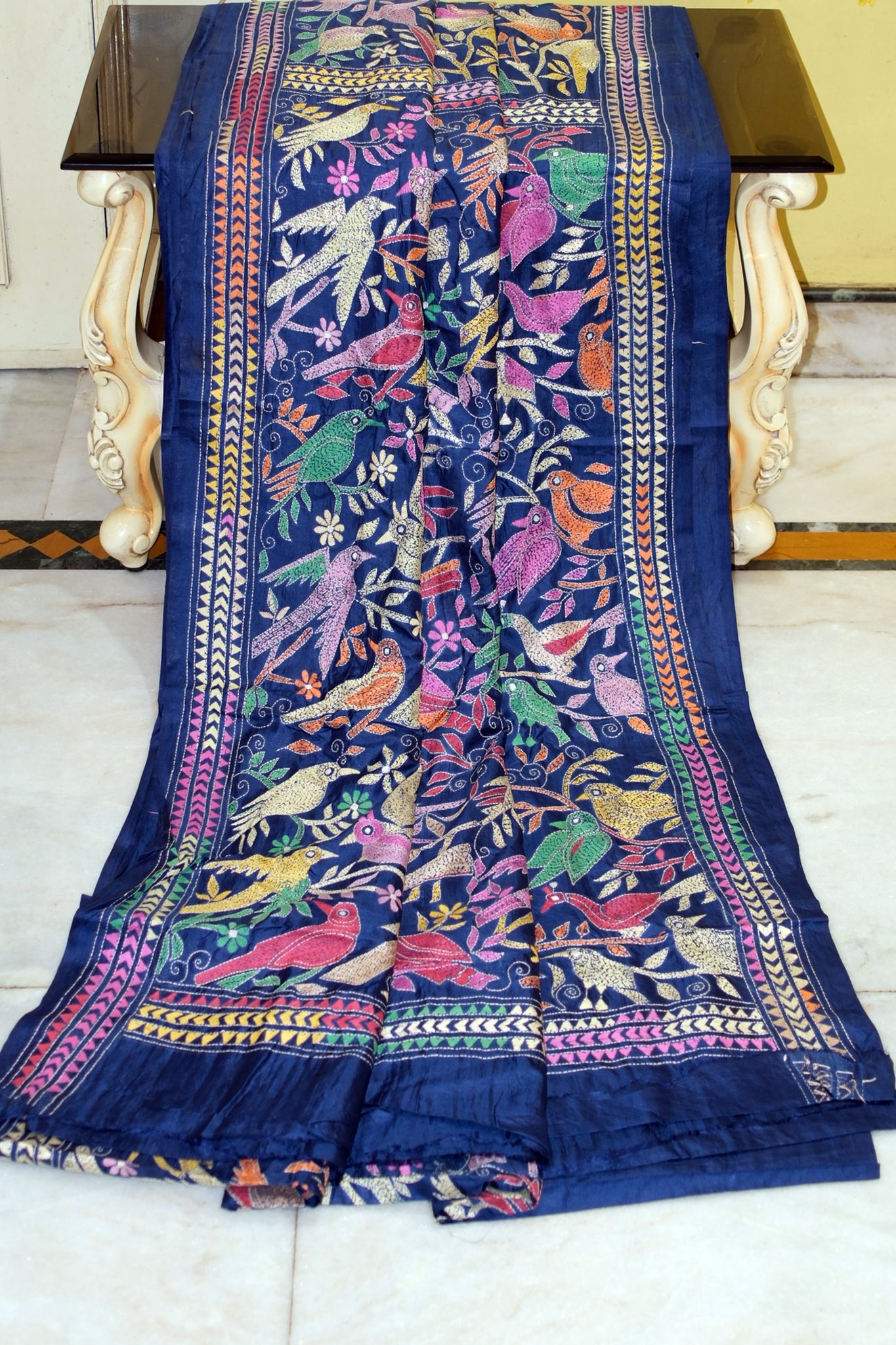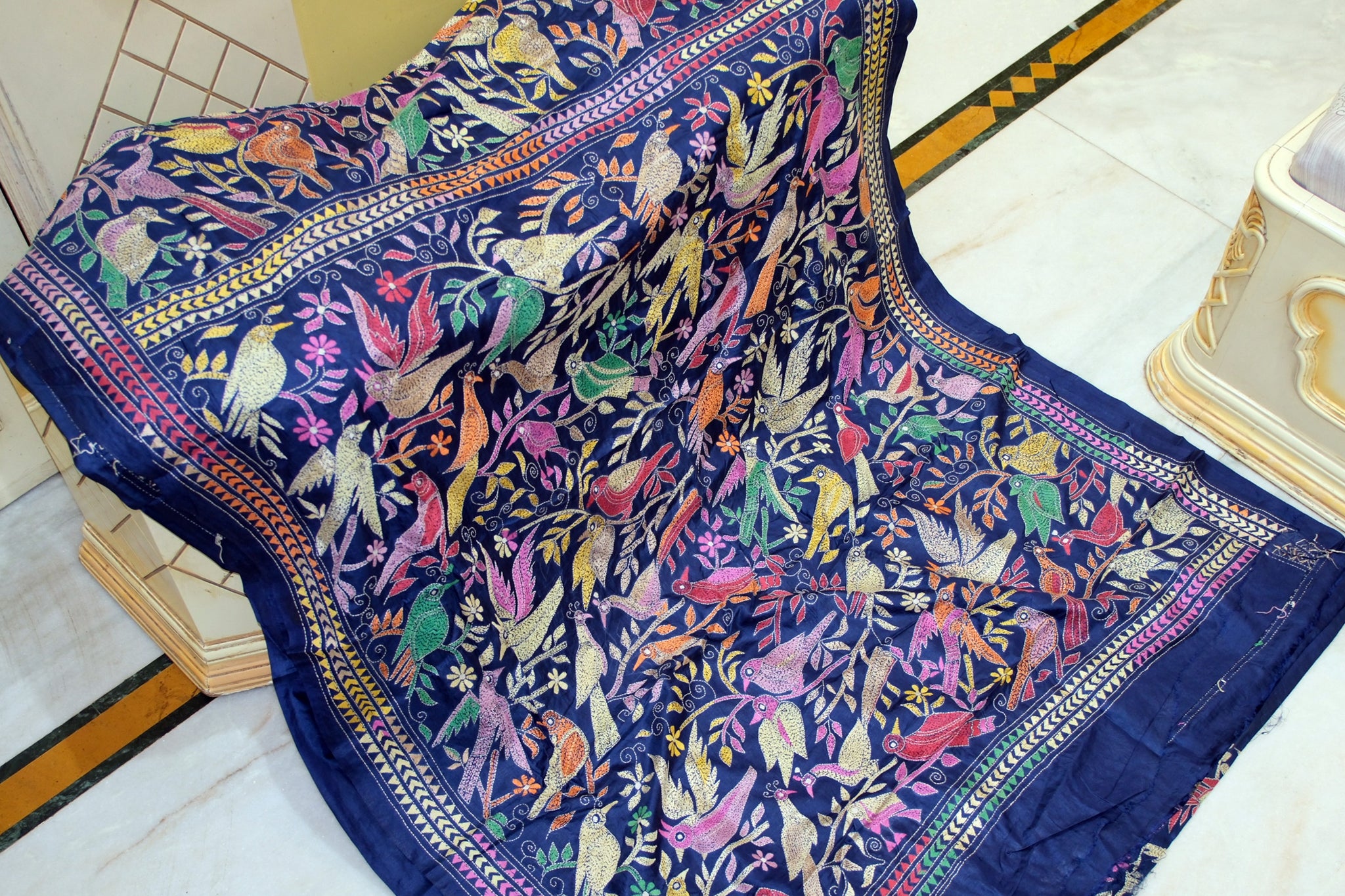 A distinguished example of traditional Kantha embroidery, this pure silk saree features meticulously hand-stitched bird motifs rendered across cloudburst blue, off-white, and multicolored grounds. The technique demonstrates the weaver's command of classical design principles, where each avian form is positioned with compositional precision, creating a refined textile that appeals to connoisseurs of authentic handloom artistry.