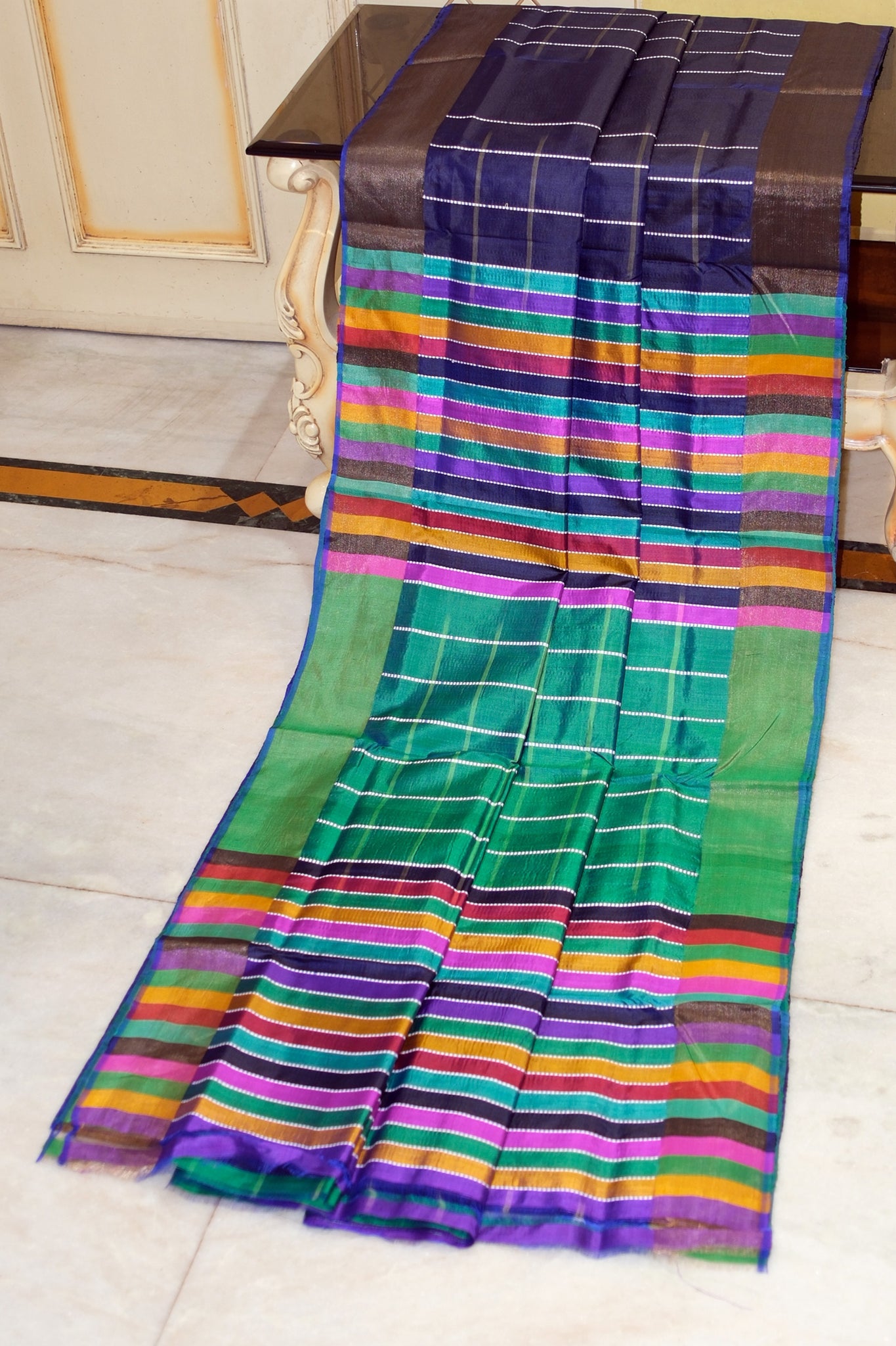 Understated luxury meets meticulous craftsmanship in this Bishnupuri checks katan silk saree. Heather indigo and myrtle green checks, accented with multicolored threads, create a refined visual rhythm that speaks to discerning taste. Each pattern is handwoven with precision on traditional looms, delivering authentic texture and movement. The luxurious silk drape ensures graceful elegance for occasions demanding both substance and style—a timeless investment in heritage weaving.
