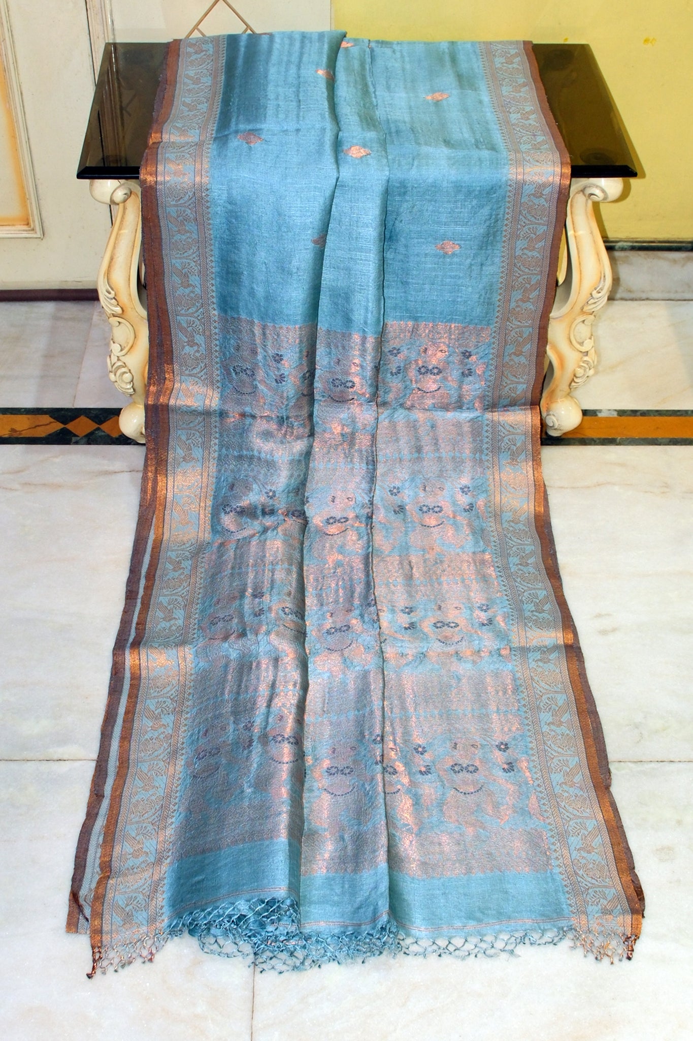 Premium Quality Tussar Baluchari Silk Saree in Moonstone Blue and Antique Golden