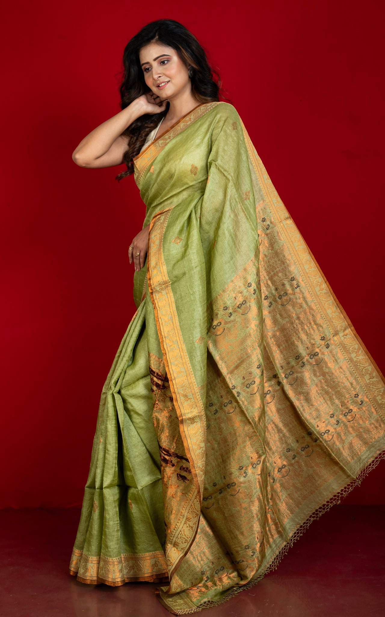 Premium Quality Tussar Baluchari Silk Saree in Wild Willow, Dark Brown and Antique Golden