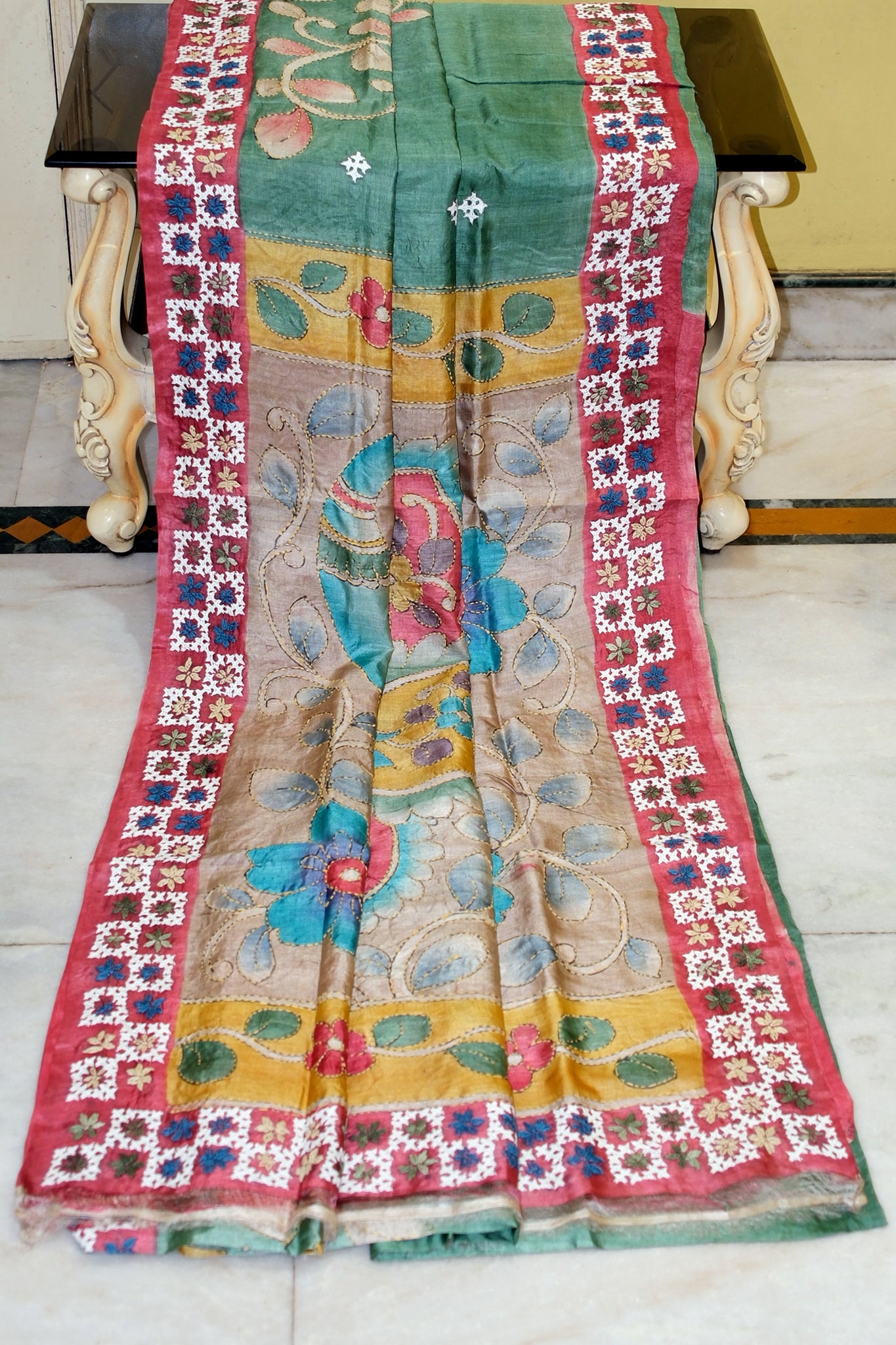Elevate your saree collection with this exquisite Tussar Kalamkari silk creation, where traditional artistry meets contemporary elegance. Hand-adorned with intricate Kantha embroidery and Kutch work, each piece showcases the masterful craftsmanship of Bengal's finest weavers. The sophisticated palette of cactus green, rich red, and vibrant multicolored accents creates a striking visual narrative perfect for celebrations and special occasions. Tussar silk's natural lustre and breathable texture ensure comfort without compromising on luxury. A timeless investment in heritage textiles that honors centuries of handloom tradition.