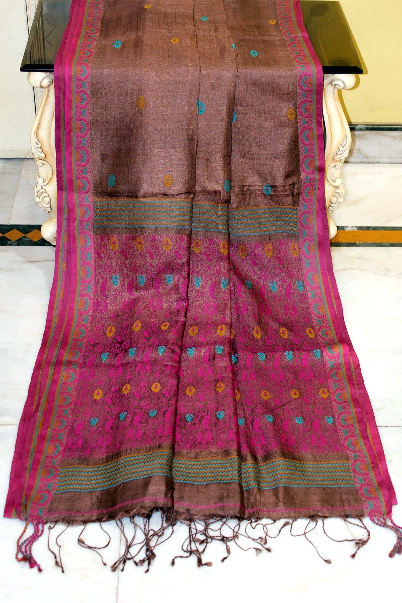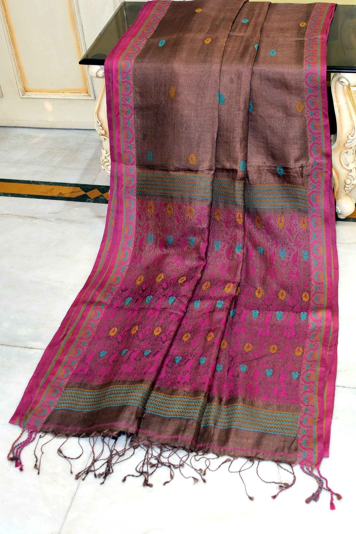 Discover the refined elegance of this premium Tussar silk saree, enriched with sophisticated Nakshi embroidery. The luxurious palette of otter brown, burnt pink, and multicolored accents creates a striking visual composition that speaks to discerning tastes. Tussar silk's natural sheen and supple drape offer unparalleled comfort, while the intricate hand-embroidered motifs showcase the skill of master artisans. This saree seamlessly transitions from ceremonial wear to special occasions, embodying the essence of heritage weaving. A timeless investment piece for those who cherish authentic handloom craftsmanship and understated sophistication.